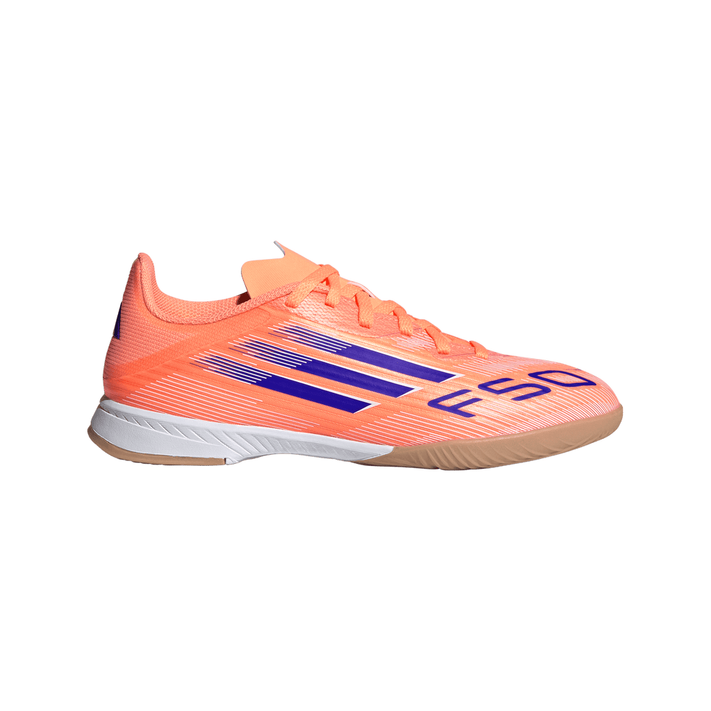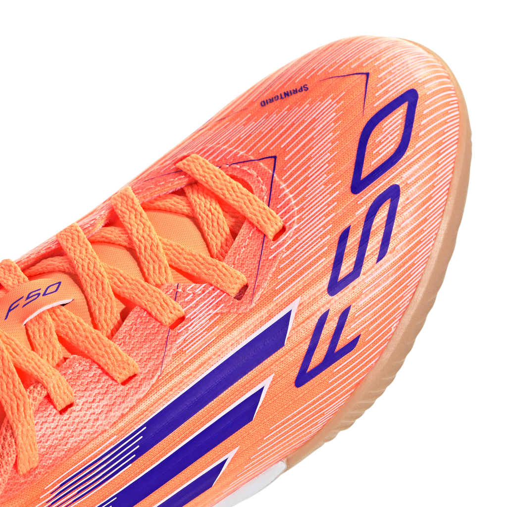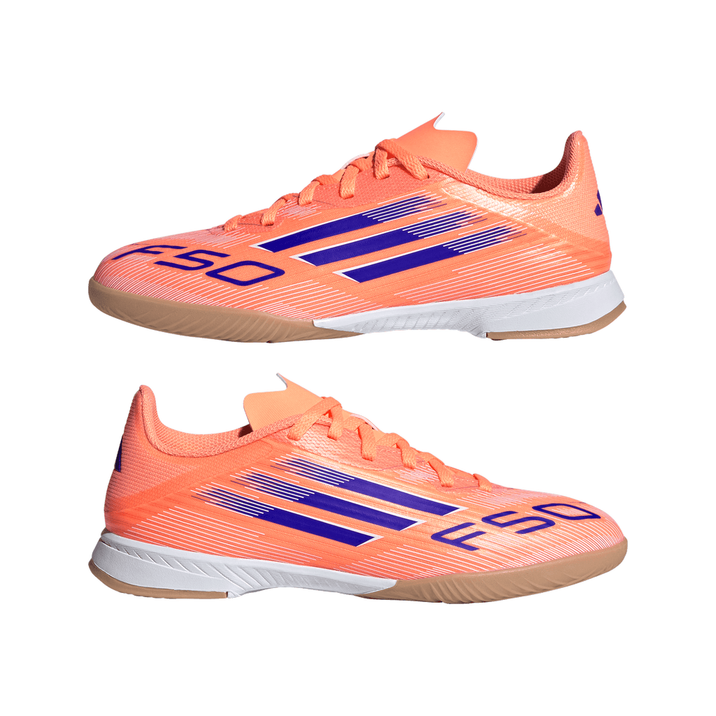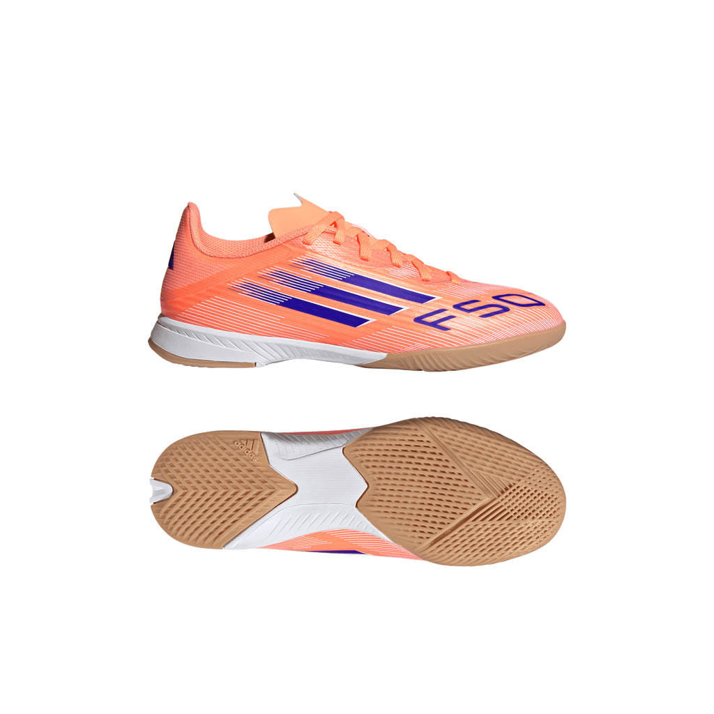 Find your fast to truly express yourself on the court. Feel the rush in adidas F50 cleats engineered for speed. Standing out with an eye-catching Sprintgrid print, the Fiberskin upper on these juniors' League soccer cleats employs a perforated tongue for cool play. That non-marking rubber outsole lays down serious pace on indoor surfaces.