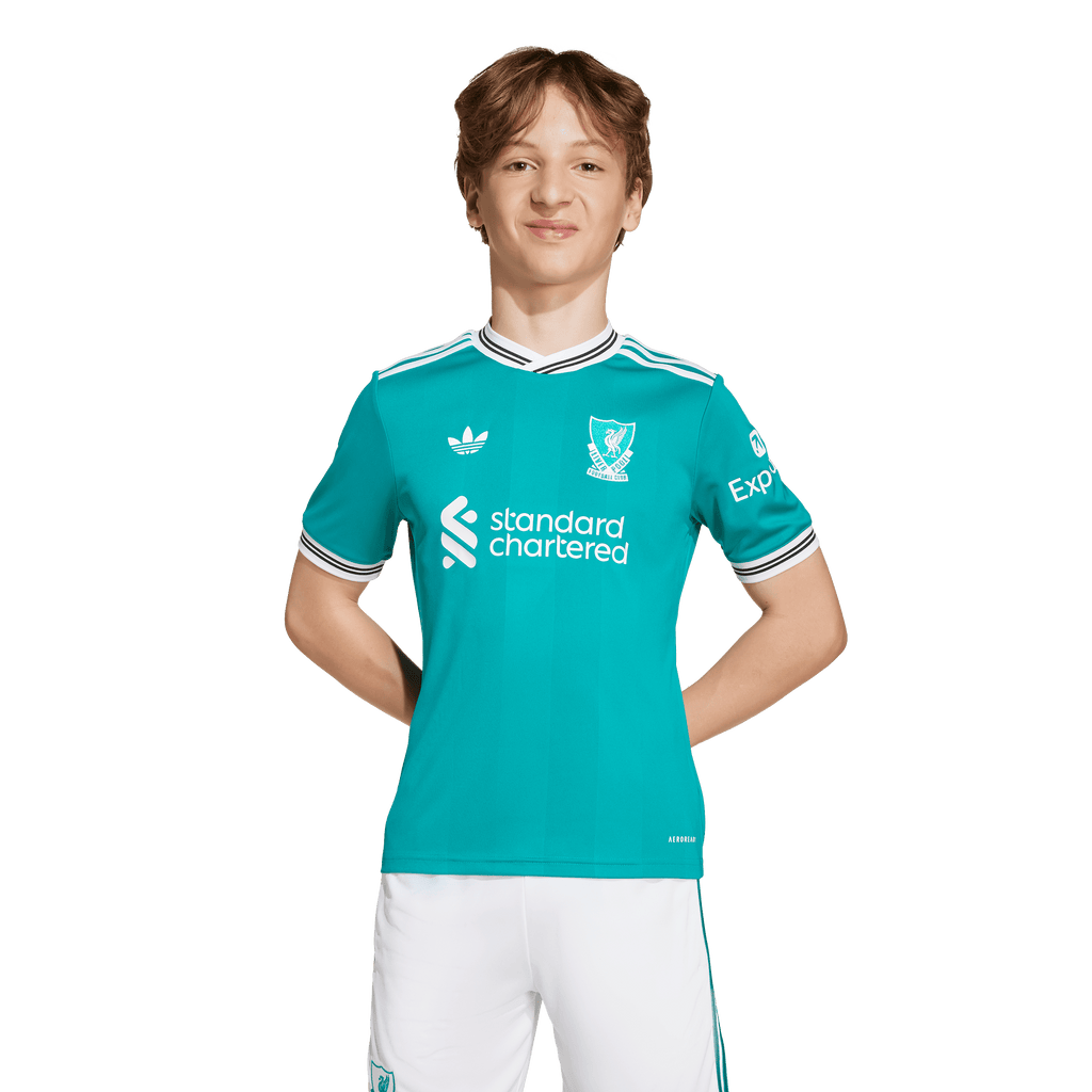 A modern football classic inspired by Liverpool FC's storied 3-Stripes history. The tonal vertical stripes on this elegant third jersey come in unmistakable adidas Equipment green. On the chest, that vintage club badge shares the spotlight with a Trefoil for the first time since 1991. Created for travelling Reds, this shirt includes moisture-managing AEROREADY so it feels as good as it looks.