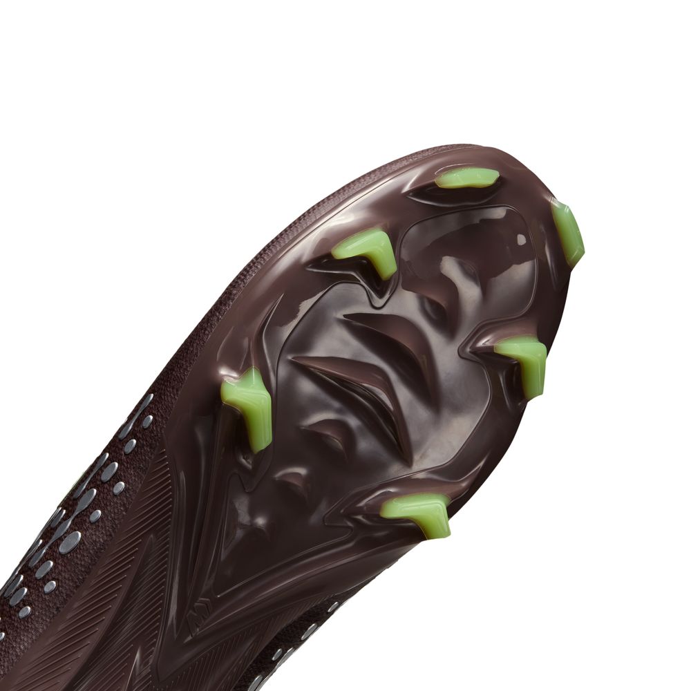The wave-like traction pattern is a series of cascading studs, so it engages more surface area of the Air Zoom unit while also providing the appropriate amount of grip. The biggest stud is the same height as our traditional middle studs, so traction is not compromised. We paired the wave-like traction with evolved chevron and blade studs to help you stop when making quick cuts.